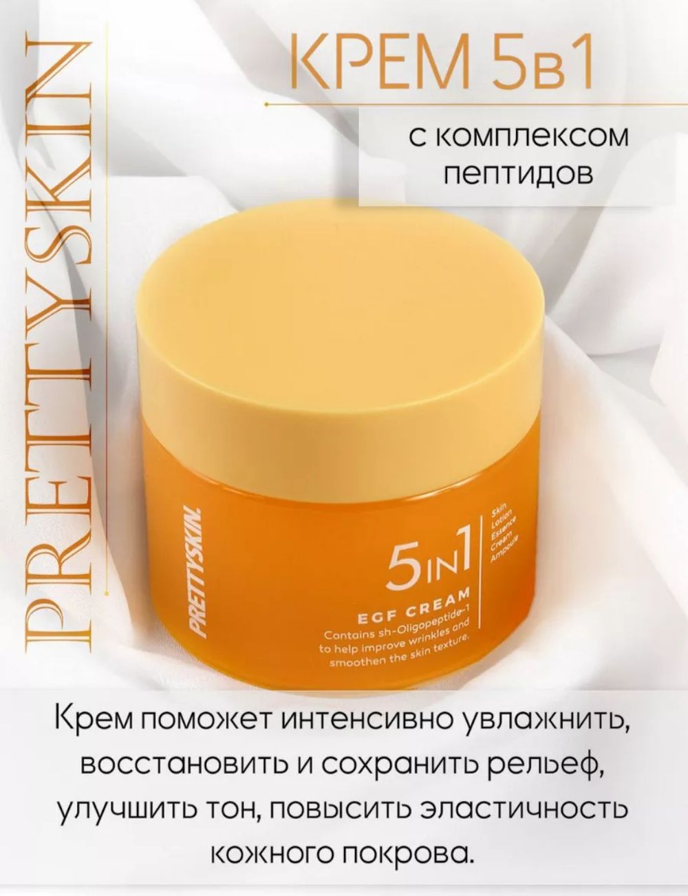 Pretty Skin предлагает восстанавливающий крем с факторами роста (EGF) 5in1, направленный на омоложение, интенсивное увлажнение и регенерацию поврежденной кожи. Формула, содержащая эпидермальный фактор роста (EGF), стимулирует обновление клеток, повышает упругость, борется с морщинами и укрепляет барьер, часто используя центеллу азиатскую, аденозин и ниацинамид.