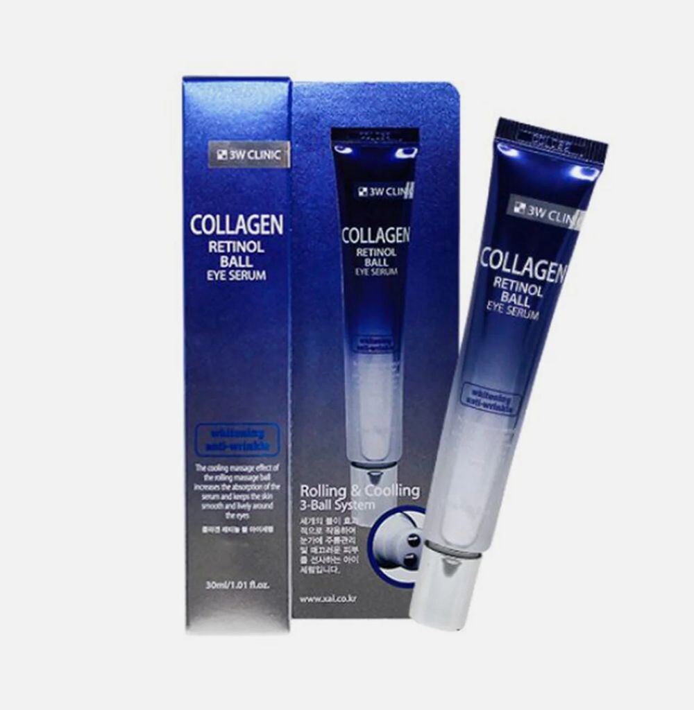 3W Clinic Collagen Retinol Eye Ball Serum является универсальным серумом, который способен увлажнять и отбеливать кожу, к тому же и разглаживая морщины.