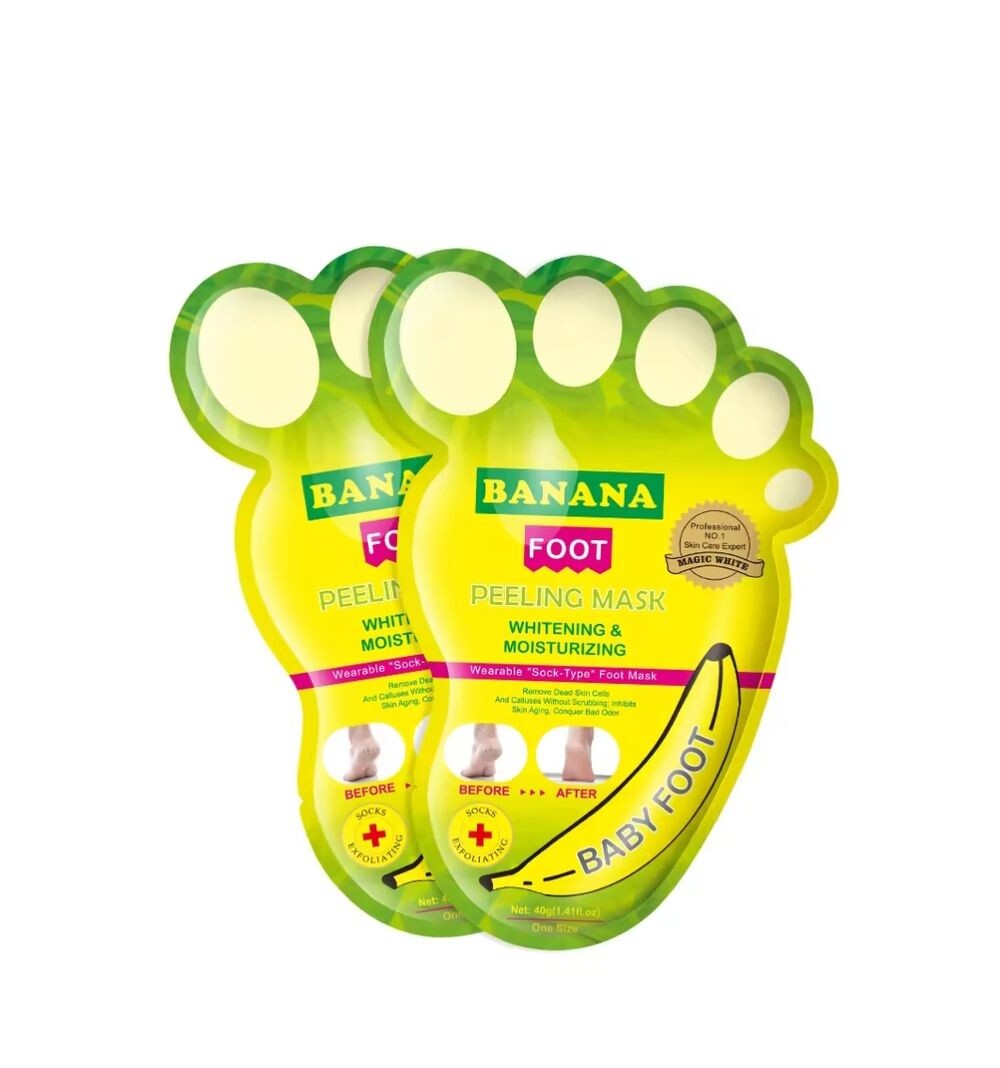 Aichun Beauty Отшелушивающая маска-носочки с экстрактом банана Banana Peeling Foot Mask, 40 мл Маска-носочки для ног эффективно ухаживает за кожей ног, стимулирует активное отшелушивание ороговевшего слоя эпидермиса, смягчает мозоли и огрубевшие участки кожи, обеспечивает регенерацию и восстановление кожных покровов. В результате кожа стоп вновь становится гладкой и ухоженной. Содержит фруктовые кислоты, лошадиный жир, керамиды, экстракт алоэ, макадамии и банана. Благодаря такому составу кожа становится более гладкой и увлажнённой.