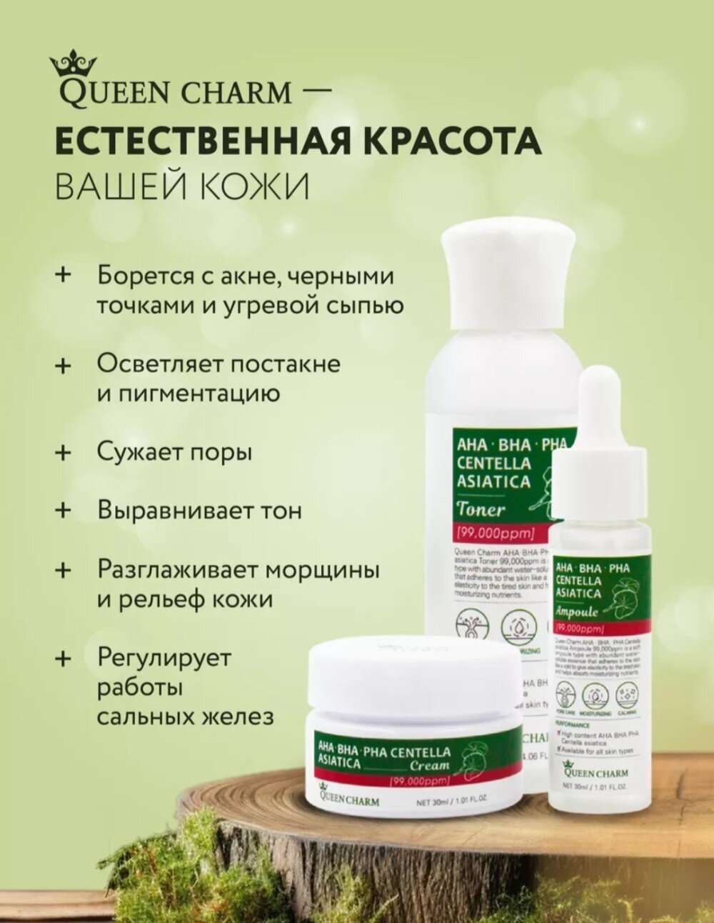 QUEEN CHARM. Набор средств для лица c AHA, BHA, PHA кислотами и центеллой азиатской, 9,9% (тонер, сыворотка крем)